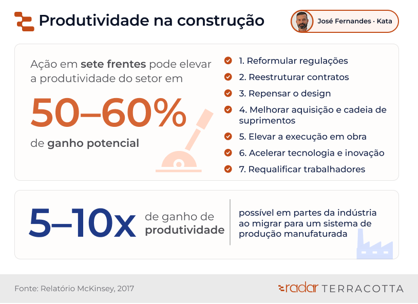 A adoção de modelos industriais, baseados em padronização, pré-fabricação e produção em escala, pode gerar ganhos de produtividade de cinco a dez vezes em partes específicas da construção (McKinsey Global Institute, 2017).