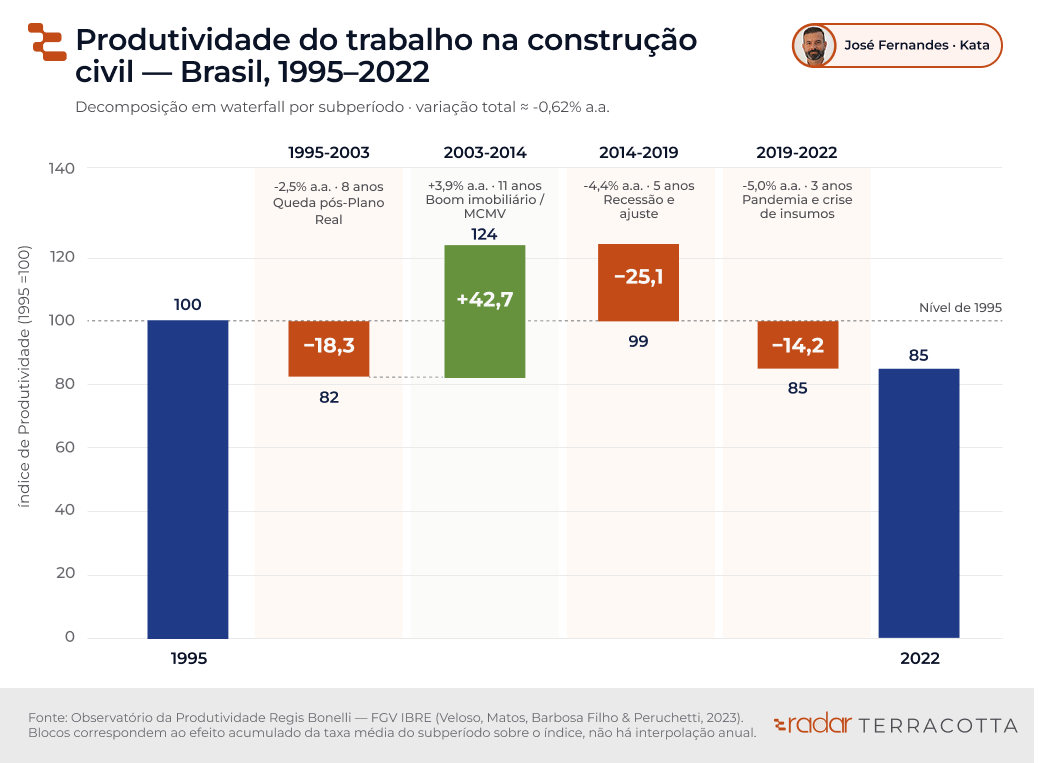 Dados do Observatório de Produtividade Regis Bonelli, da FGV IBRE, indicam que a produtividade da construção civil no Brasil apresentou queda média de aproximadamente -0,6% ao ano entre 1995 e 2022.