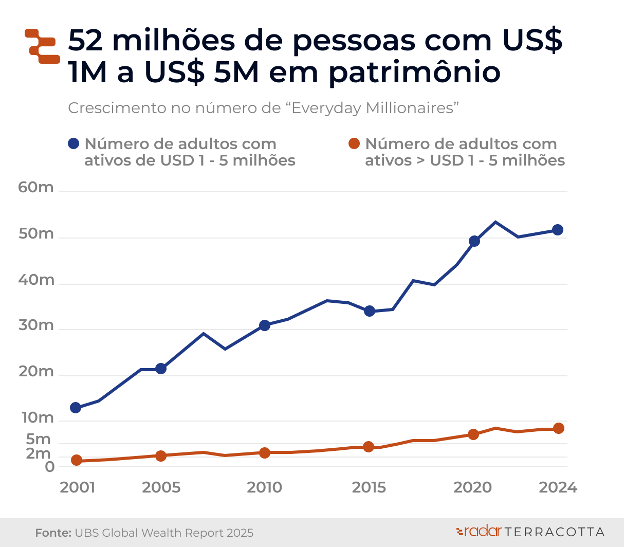 De 2001 a 2024, esse grupo cresceu de cerca de 10 milhões para mais de 52 milhões, segundo o UBS Global Wealth Report 2025.