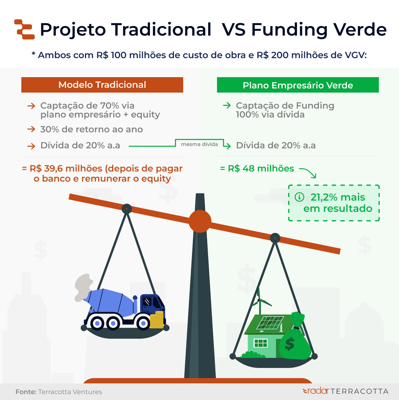 Um projeto de R$ 100 milhões com VGV de R$ 200 milhões pode gerar R$ 39,6 milhões de resultado financiado no plano empresário tradicional e demandando sócios no equity.