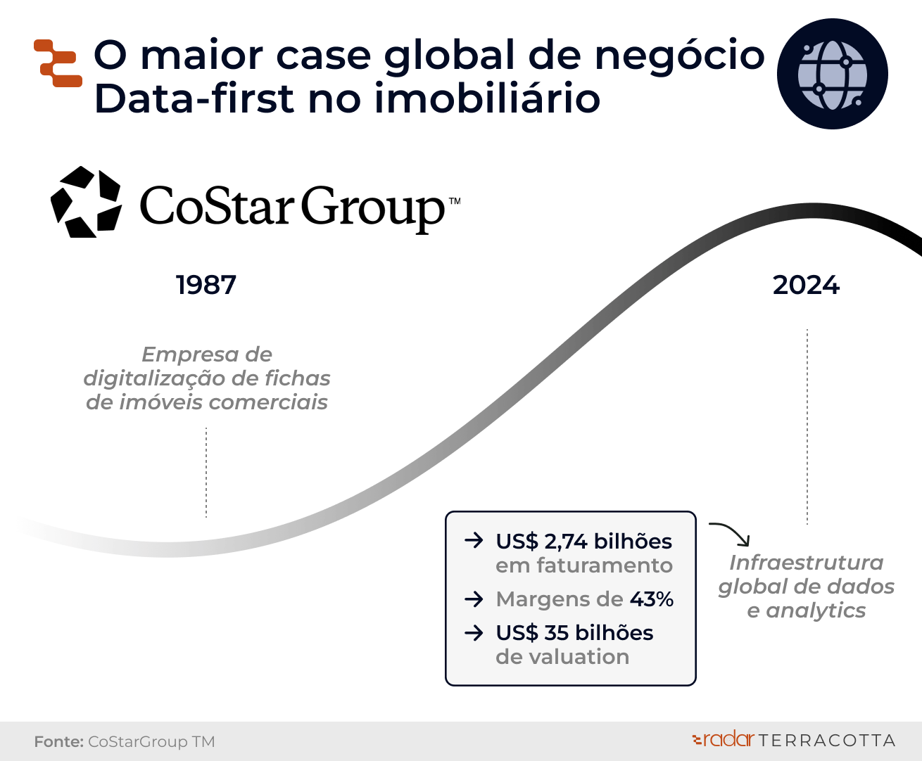 O que começou em 1987 como uma empresa de digitalização de fichas de imóveis comerciais evoluiu para um ecossistema que, em 2024, faturou US$ 2,74 bilhões, operando com margens de 43% e um valuation de US$ 35 bilhões.