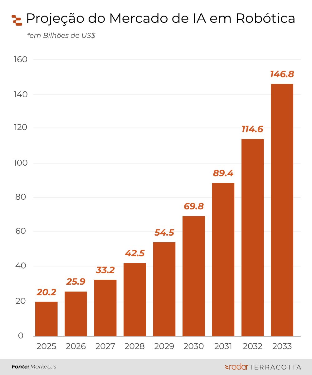 Espera-se que o mercado de robótica com IA atinja US$ 146 bilhões até 2033.