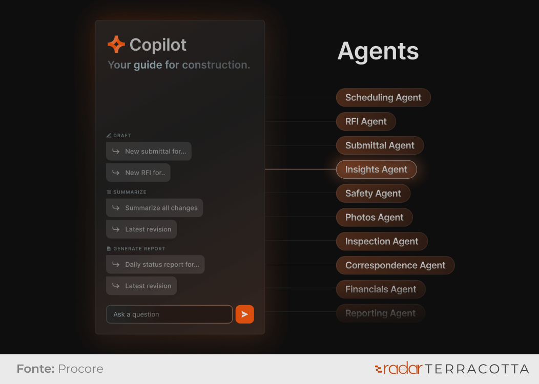 De um assistente conversacional contextualizado (Procore Assist) à geração de relatórios via análise de fotos, passando pelo Agent Builder — que permite a qualquer usuário criar agentes personalizados com linguagem natural, sem precisar programar.