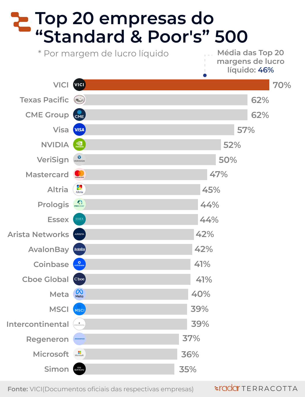 O resultado é uma estrutura de margens excepcionalmente altas – acima de 70% –, colocando a VICI entre as empresas mais rentáveis do S&P 500 e reforçando a resiliência do seu modelo de negócio e bate com folga empresas como NVidia, Microsoft, Visa e Texas Pacific.