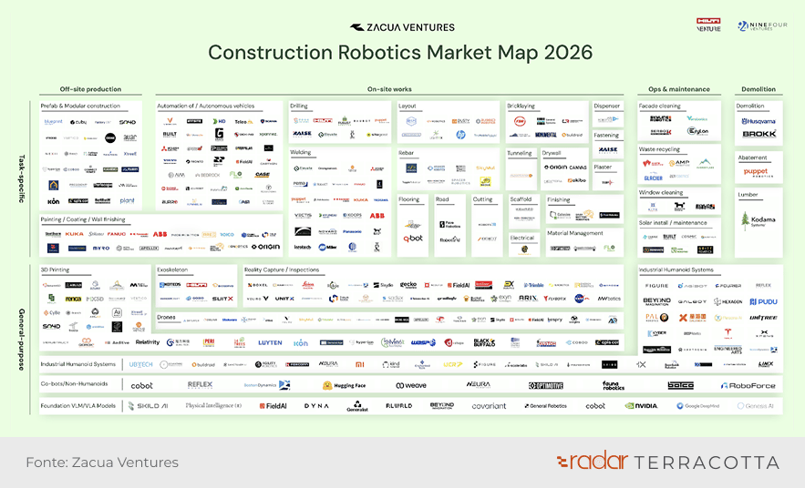 Até pouco tempo, o assunto parecia difuso. A narrativa dominante ainda era a de uma “obra automatizada” no futuro. O que o mapa mostra é algo diferente: a robótica já está sendo aplicada de forma concreta dentro do canteiro.