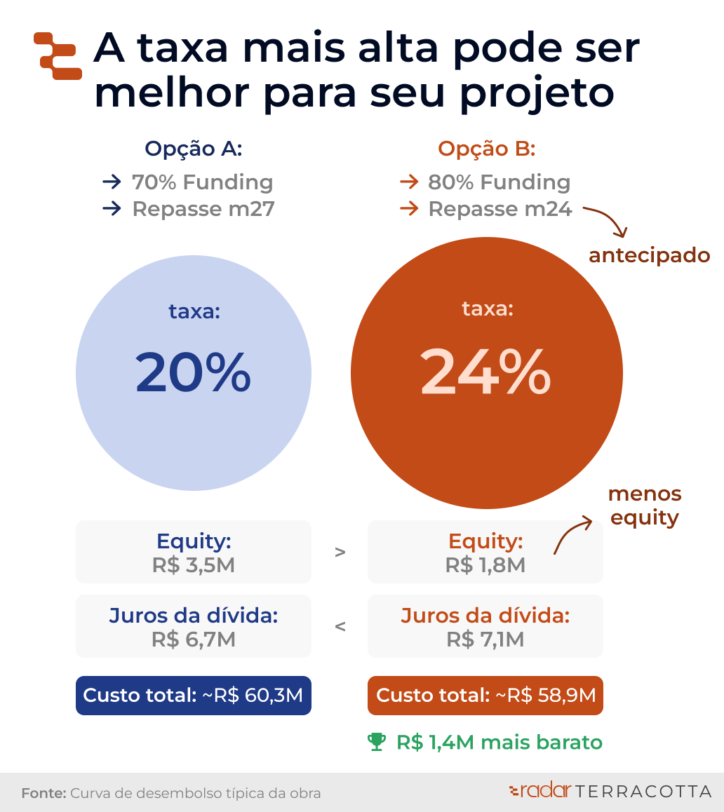 Imagine um projeto de R$ 50 milhões de custo de obra. O empreendedor tem duas alternativas de financiamento: