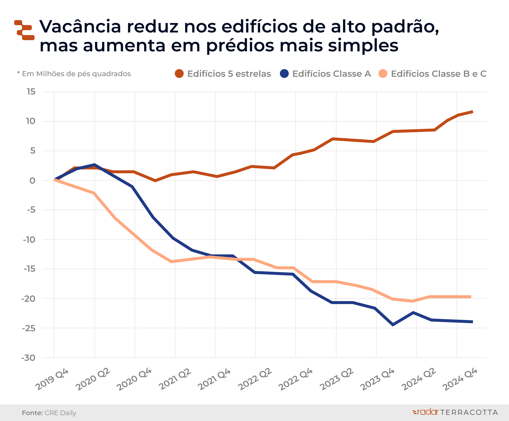 É verdade que assim como em SP, houve uma recuperação na taxa de vacância em lajes corporativas, mas isso restrito a prédios de primeiro padrão, e não em edificações mais antigas e de padrão mais baixo.