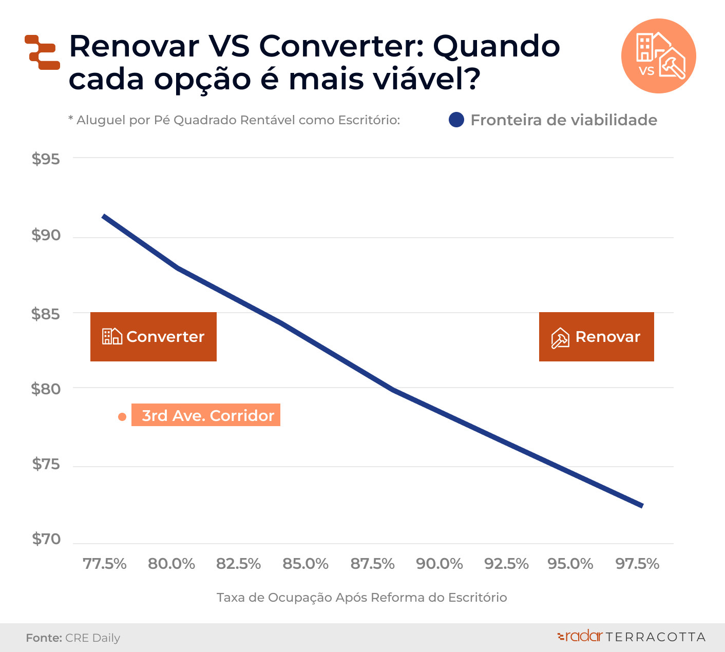 A linha azul representa a fronteira de viabilidade: combinações de aluguel por pé quadrado e taxa de ocupação que ainda tornam a renovação como escritório financeiramente justificável.