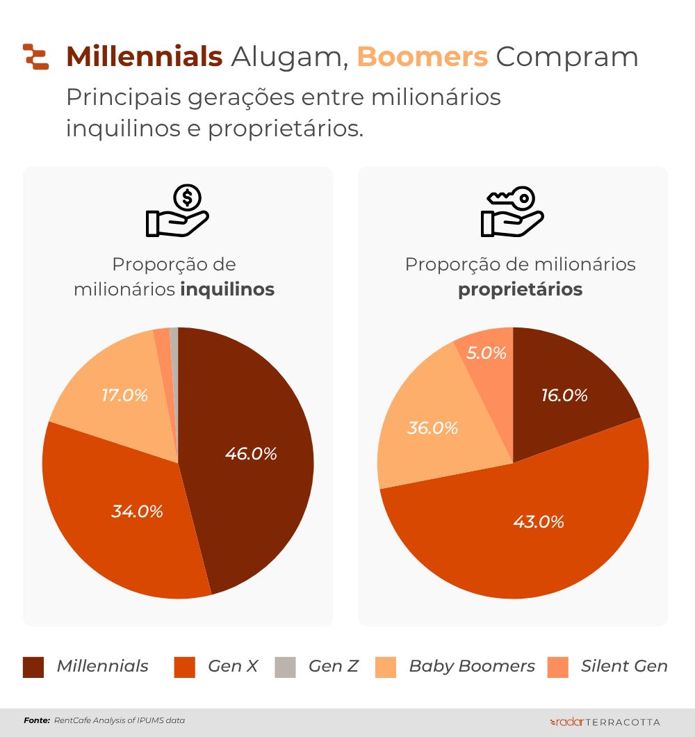Já entre os proprietários milionários, predominam os mais velhos: 43% são da geração X e 36% são baby boomers.