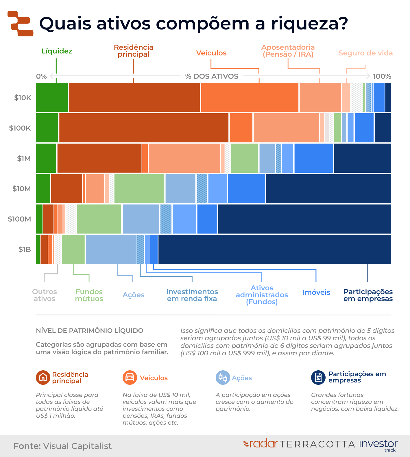 O gráfico tem origem em uma análise do Visual Capitalist, construída a partir de dados do Survey of Consumer Finances (SCF) do Federal Reserve dos EUA — uma das bases mais completas sobre composição patrimonial das famílias, segmentada por faixas de patrimônio líquido.