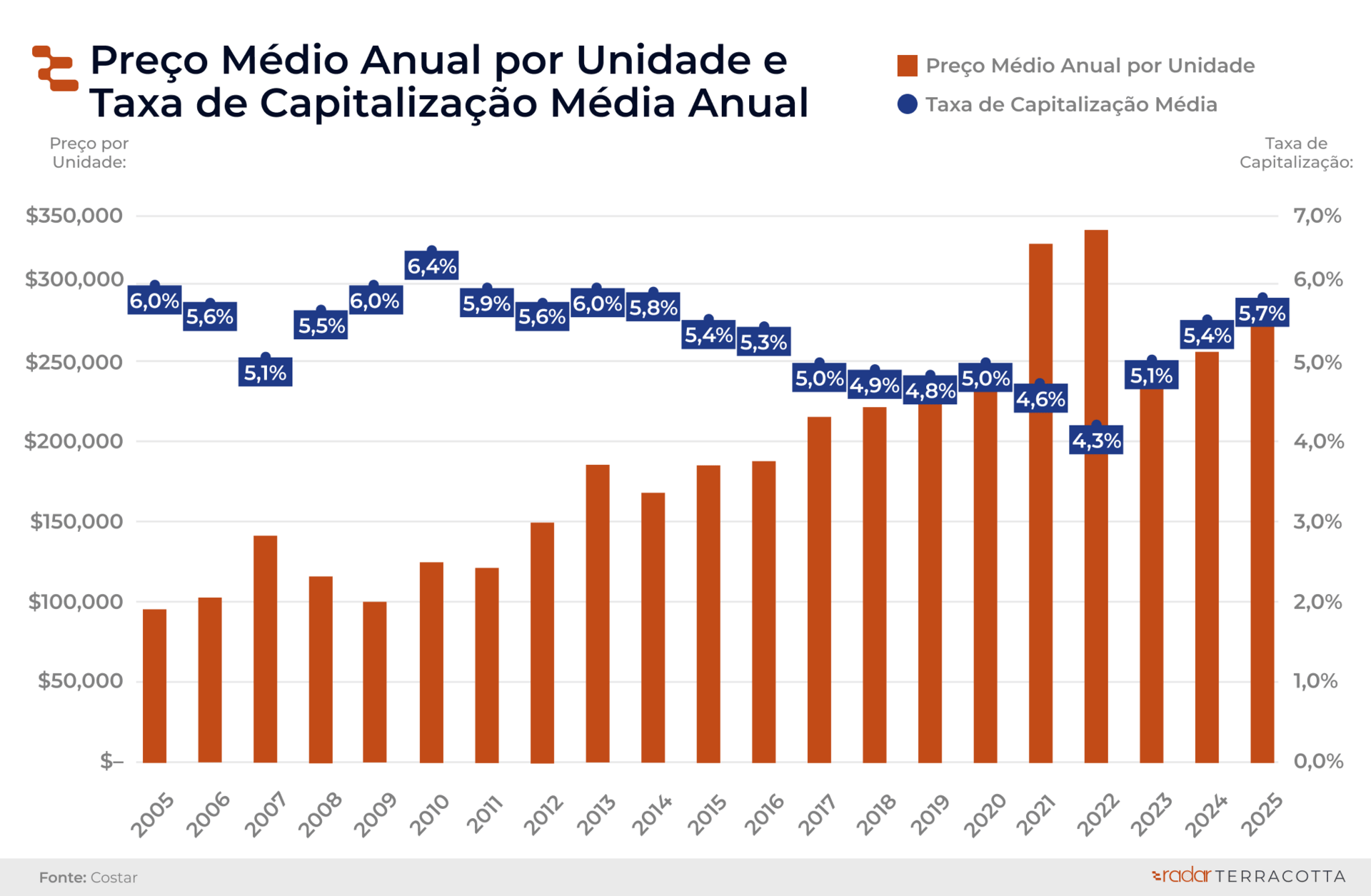 Desde 2005, o cap rate médio de multifamily oscilou entre 6,4% e 4,3% — este último observado apenas no período de juros mínimos durante a pandemia.