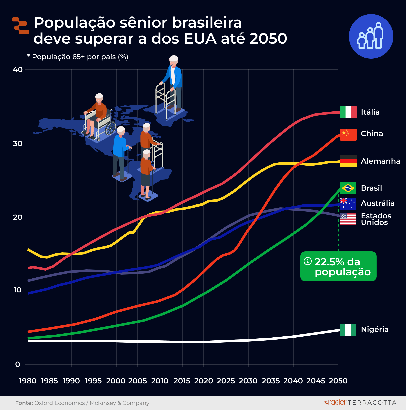 A ONU estima que o Brasil terá 58 milhões de pessoas com 65+ em 2050.