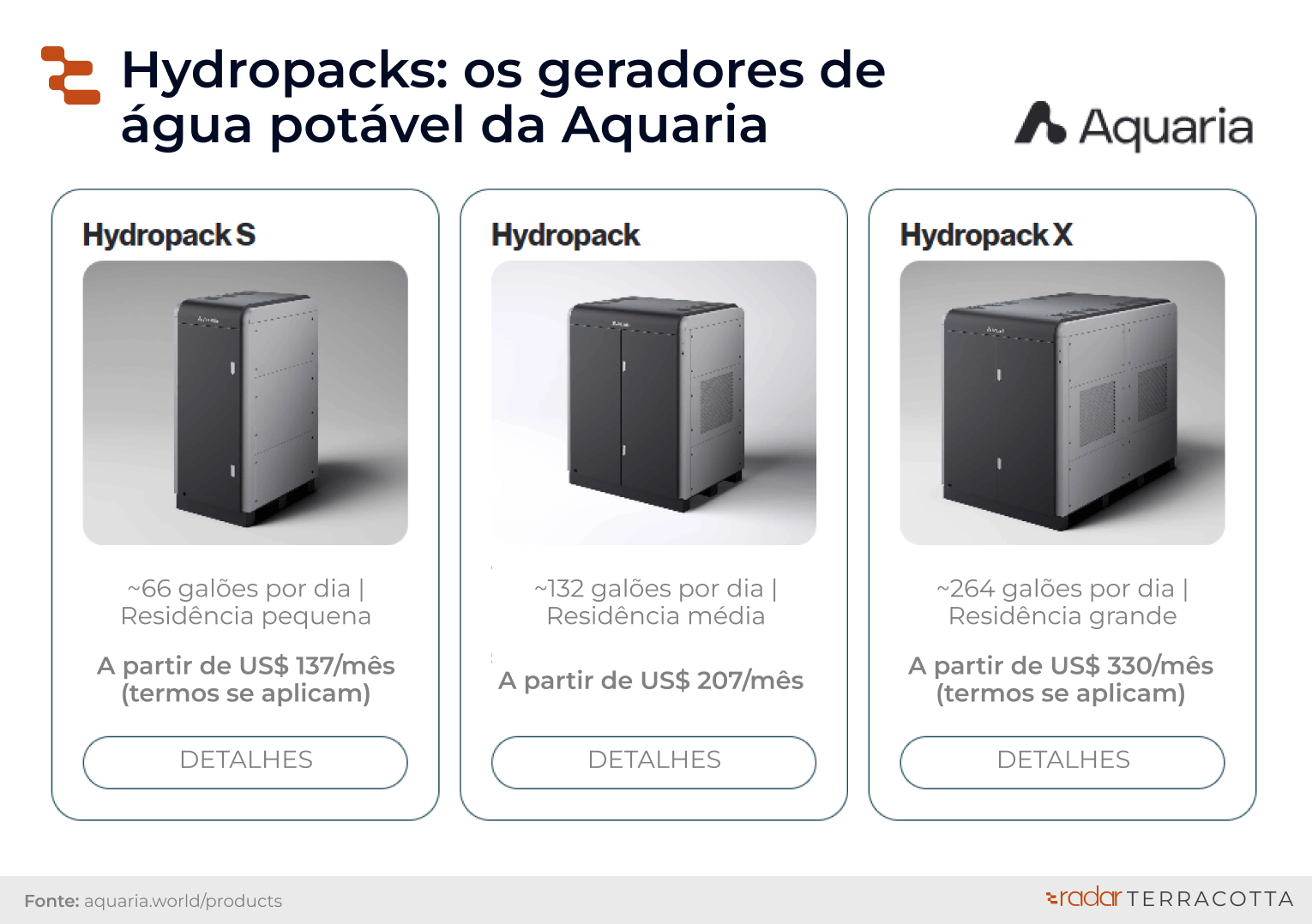A Aquaria está desenvolvendo sistemas que captam a umidade do ar, condensam e purificam para gerar água potável de forma descentralizada.