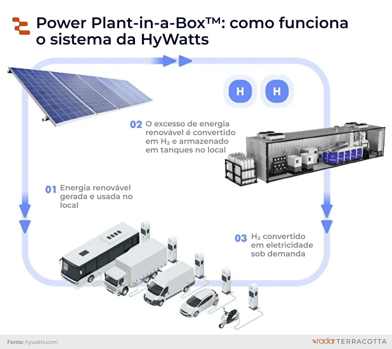 Como o caso da HyWatts, que desenvolveu um sistema modular de geração e armazenamento de energia baseado em hidrogênio, que funciona como uma espécie de power plant-in-a-box.