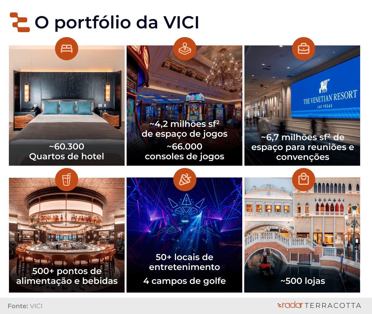 Para a VICI, isso significa receber um fluxo de aluguel previsível, indexado e com despesas operacionais próximas de zero.